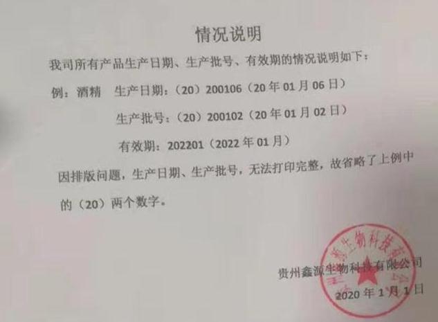 1月31日,記者在位于貴陽市都司路的一家藥店購買醫用酒精,每人限購兩瓶,100毫升/瓶,每瓶1.5元。當天晚上,記者準備使用酒精時發現生產日期有問題。于是記者查閱了貴州鑫源生物科技有限公司官網。官網顯示公司成立于2017年。帶著疑惑,記者于2月1日聯系上貴州鑫源生物科技有限公司董事長汪波,董事長給出了答復:“因排版問題,生產日期、生產批號,無法打印完整,故省略了(20)兩個數字。”